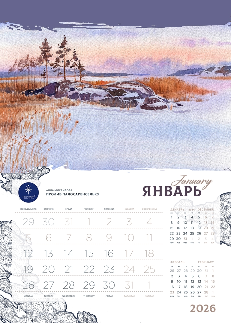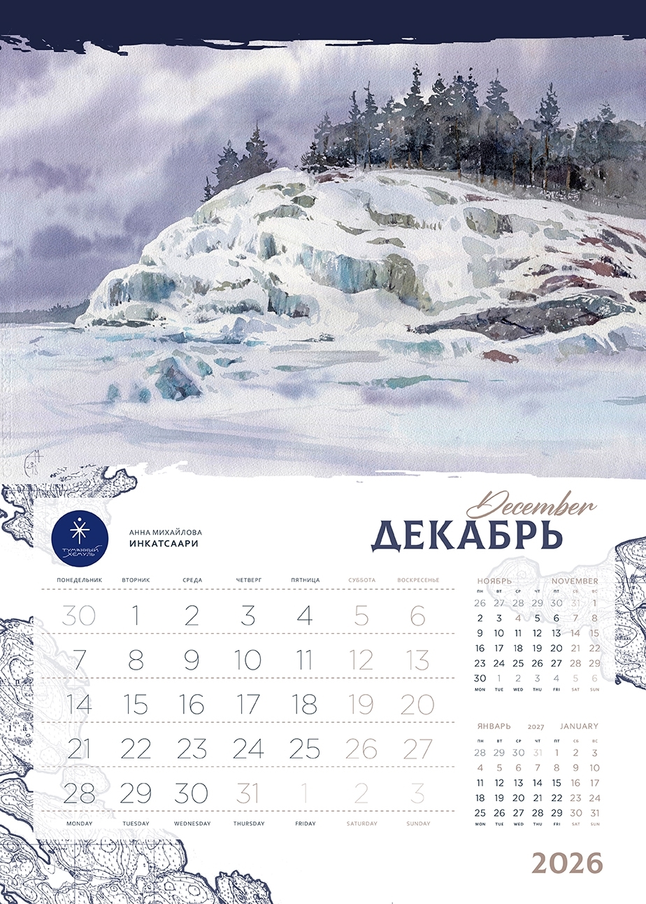 Календарь Анны Михайловой, известного акварелиста из Санкт-Петербурга. Здесь изображены прекрасные места Карелии, полные поэзии ладожские шхеры и окрестности арт-пространства "Туманный хемуль", где автор проводит свои мастер-классы и пленэры.
