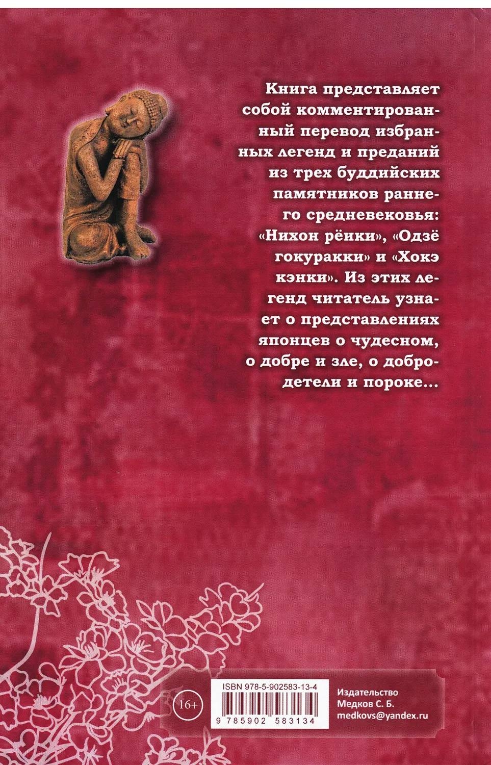 Книга представляет собой комментированный перевод избранных легенд и преданий из трех буддийских памятников раннего средневековья: "Нихон рёики", "Одзё гокуракки" и "Хокэ кэнки". Из этих легенд читатель узнает о представлениях японцев о чудесном, о доброте и зле, о добродетели и пороке. Почти все легенды публикуются на русском языке впервые.