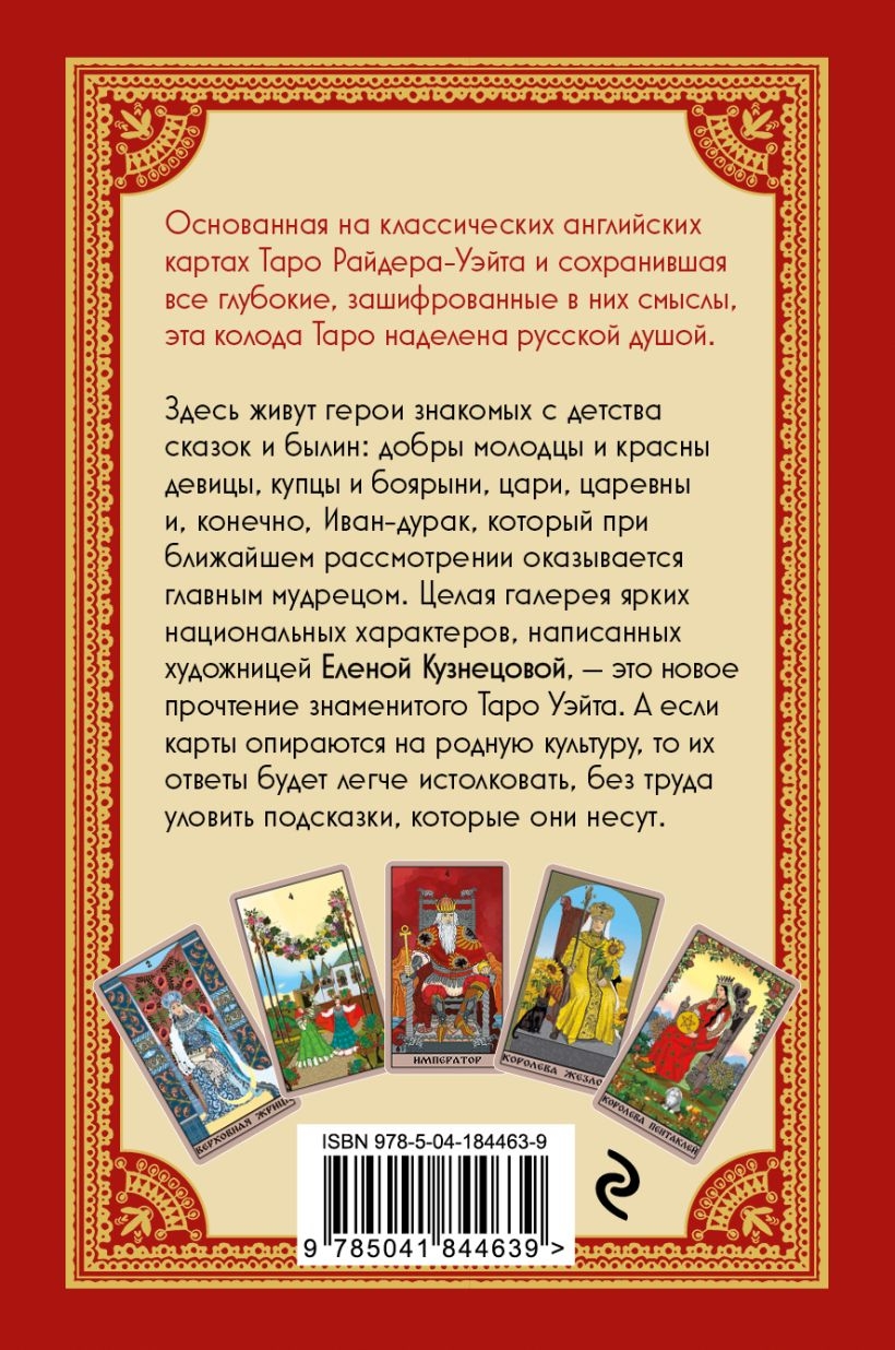 Основанная на классических картах таро Уэйта и сохранившая все глубокие, зашифрованные в них смыслы, эта колода таро наделена русской душой. Здесь живут герои знакомых с детства сказок и былин: добрые молодцы и красные девицы, купцы и боярыни, цари, царевны и, конечно, Иван-Дурак, который при ближайшем рассмотрении, оказывается главным мудрецом. Целая галерея ярких национальных характеров, написанных художницей Еленой Кузнецовой — это новое прочтение знаменитого Таро Уэйта. А если карты опираются на родную культуру, то их ответы будет легче истолковать, без труда уловить подсказки, которые они несут. Колода в изысканном подарочном оформлении для коллекционеров и всех любителей волшебного мира таро.