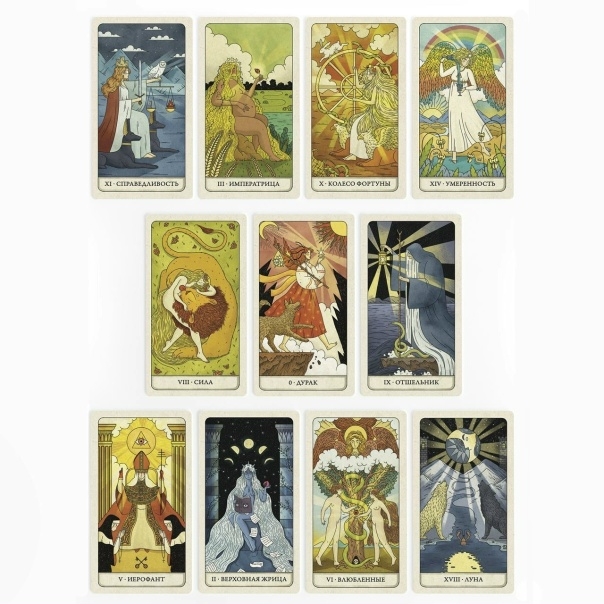 Карты выполнены из плотного картона, покрыты защитным лаком. В комплект входит коробка, руководство на русском языке с автографом автора и обучающей инструкцией, толкованием и описанием раскладов и значений. Эта книга поможет вам освоить расклады и глубже понять смысл каждой карты.