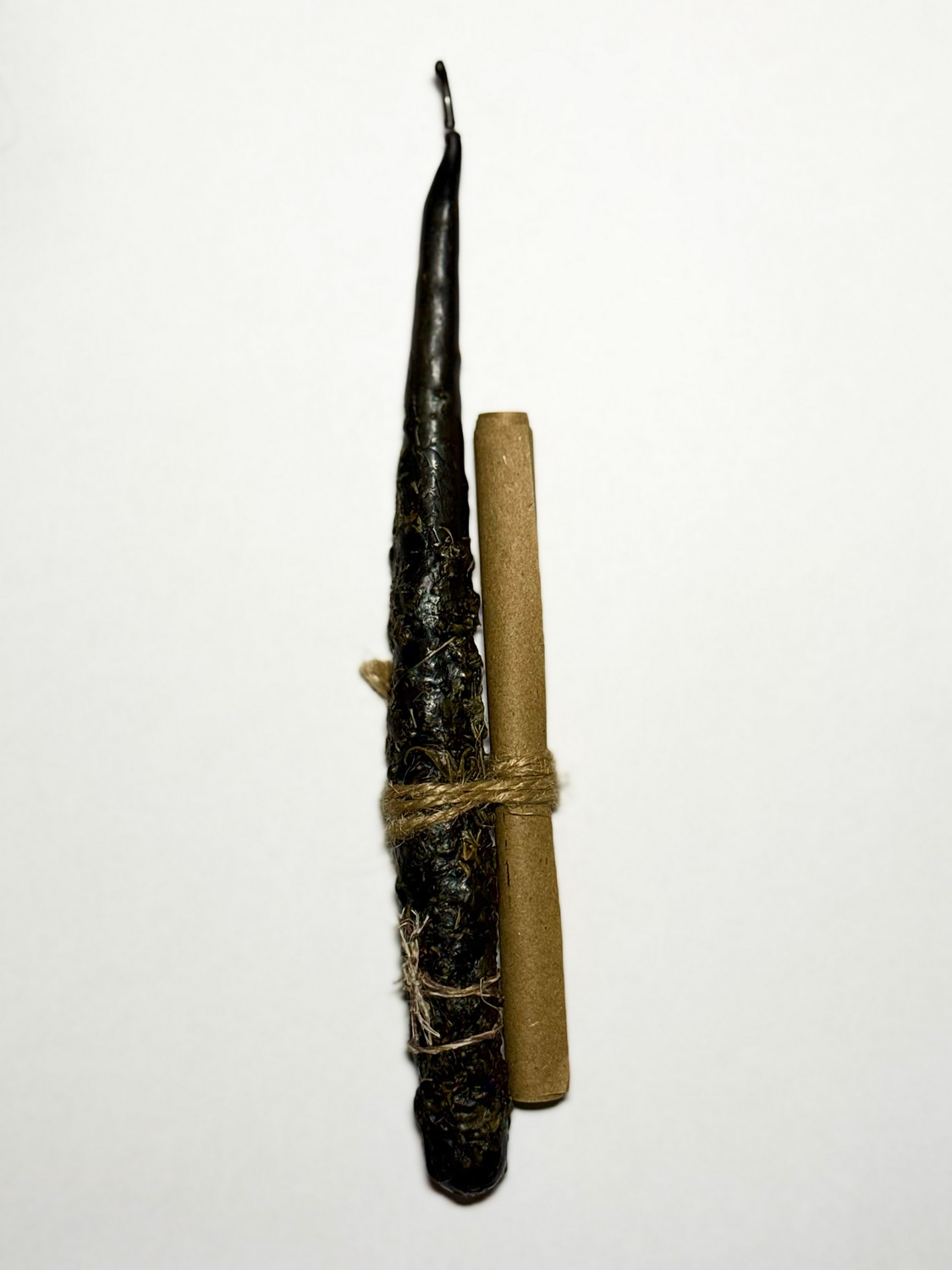 Состав: 100% пчелиный воск, полынь, зверобой, крапива, соль четверговая, уголь осины.