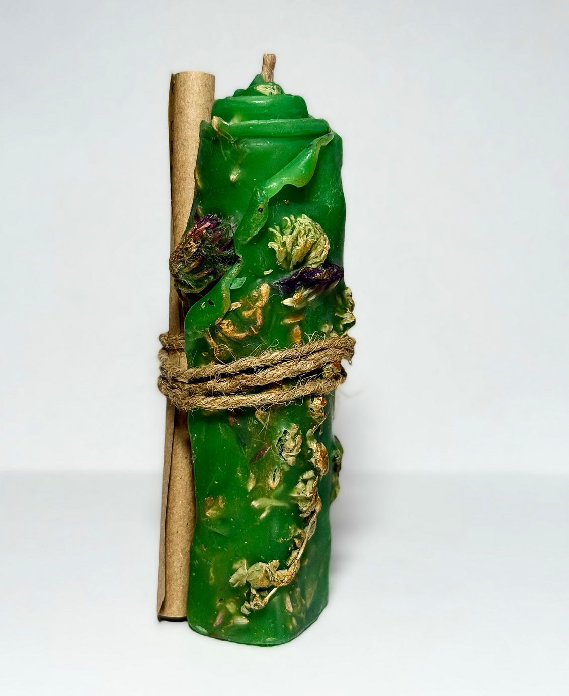 Свечи изготовлены вручную на растущей луне, с добавлением денежных трав и трав для привлечения удачи.