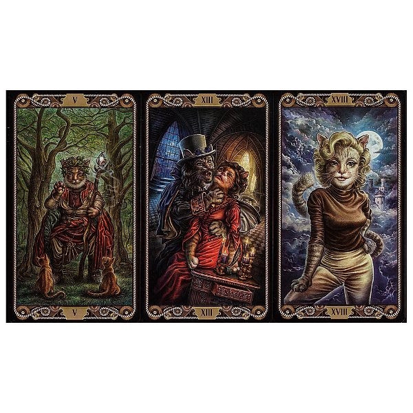 Мистическая любовь человечества к кошкам породила не одну колоду, но CatTarot стала действительно выдающейся среди них. Кошки здесь не просто максимально очеловечены, это настоящий параллельный мир, где знаменитые личности и вымышленные персонажи от Брижит Бардо и Чингисхана до Золушки и Джеймса Бонда обзавелись вибриссами и пушистыми хвостами.