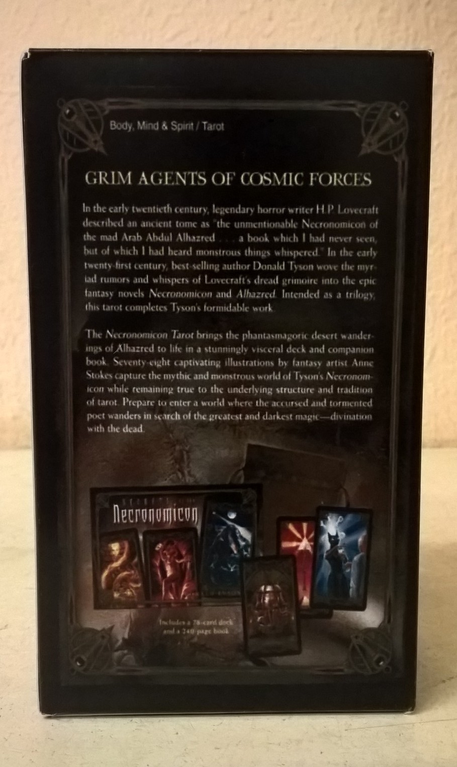 Таро Некрономикон — сильная, пульсирующая колода, отражающая темную бездну бессознательного, что находится глубоко в каждом человеке. Страсти, инстинкты, борьба, власть и безжалостность — вот что представляют собой все образы 78 карт. Таро Некрономикон от издательства Llewellyn передает атмосферу тьмы и ужаса произведений Лавкрафта и основана по большей части на романе создателя колоды Дональда Тайсона (Donald Tyson) — «Некрономикон: странствия Альхазреда», а также населена ужасными богами, зловещими монстрами и всеми Семью правителями Древних (из книги «Некрономикон»). Стоит сразу отметить, что чистых сюжетных линий из произведений Лавкрафта колода не предусматривает, но связи и заимствования безусловно есть (именно в Старших Арканах). Старшие Арканы в целом соответствуют структуре таро Райдера-Уэйта и в них учитываются астрологические значения, соответствующие принципам Ордена Золотой Зари. Однако, эта колода была простой и плоской, не будь у нее своих ключевых особенностей трактования. Например, 5 Иеорофант в качестве Дагона обретает абсолютно зловещее значение. 7 Аркан Колесница становится Вавилонским Зверем, управлять которым невозможно. Это необузданная сила, уничтожающая волю и поглощающая души. 20 Аркан Солнца выжигает все на своем пути. Каждая карта подписана именем изображенного персонажа. 0 Дурак — Азотот (Воздух) 1 Маг — Ньярлатхотеп (Меркурий) 2 Верховная жрица — Баст (Луна) 3 Императрица — Шуг-Ниггурат (Венера) 4 Император — Амон (Овен) 5 Иерофант — Дагон (Телец) 6 Любовники — Глубоководный и Невеста (Близнецы) 7 Колесница — Вавилонское чудовище (Рак) 8 Сила — Сегот (Лев) 9 Отшельник — И'таккуа (Вирог) 10 Колесо — Йог Сотот (Юпитер) 11 Справедливость — Спавн в сфере (Весы) 12 Повешенный — Колодец серафима (Вода) 13 Смерть — Цатоггуа (Скорпион) 14 Умеренность — Реаниматоры (Стрелец) 15 Дьявол — Ктулху (Козерог) 16 Башня — Великий Зиккурат (Марс) 17 Звезда — Иштар (Водолей) 18 Луна — Гончие Ленга (Рыбы) 19 Солнце — Пустое пространство (Солнце) 20 Суд — Хранитель Эдема (Огонь) 21 Мир — Иг (Сатурн) Младшие Арканы представляют захватывающие сюжетные линии, соответствующие определенным Мастям: Жезлы показывают борьбу расы Глубоководных (Deep Ones) с Атлантами. Жезл выступает инструментом власти и могущества, попадающий в конечном итоге в руки угнетаемых; Кубки — оборотную сторону египетского культа Баста; Мечи — череду насилия, которое происходит в Дамаске из-за страстей; Диски — ритуалы некромантии. Таро Некрономикон подойдет опытным тарологам, не боящимся изучать темные закоулки своей души.